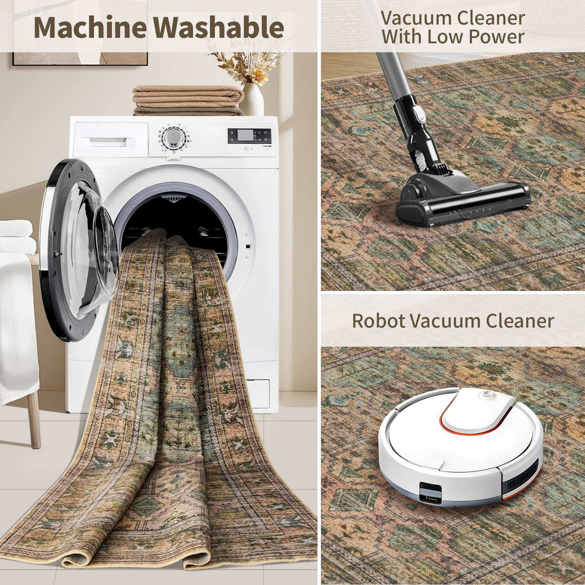 Our soft, washable rugs are crafted to simplify your life, offering effortless care and maintenance: