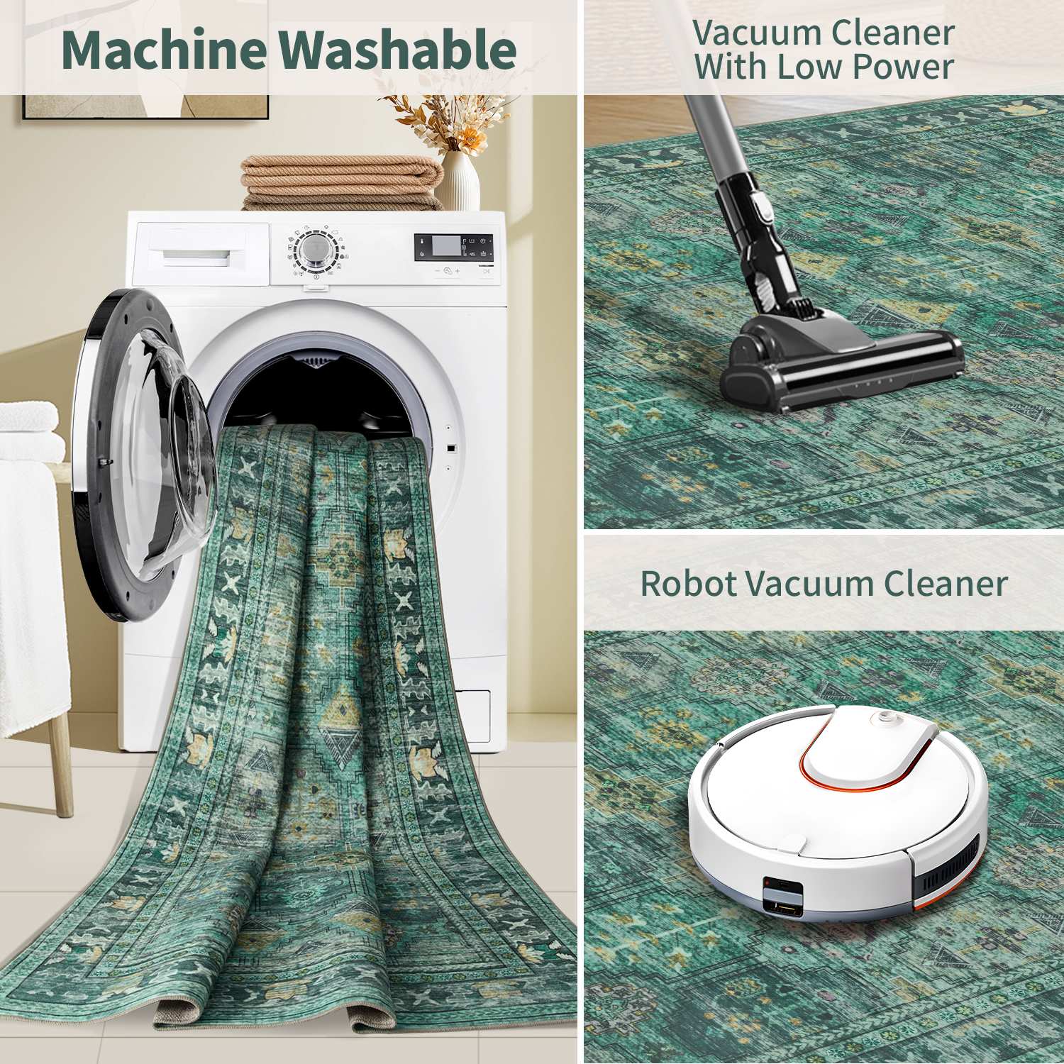 Our soft, washable rugs are crafted to simplify your life, offering effortless care and maintenance: